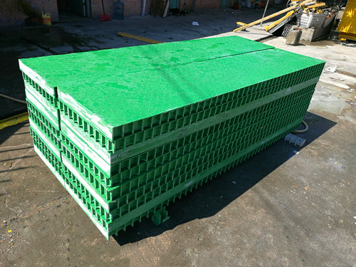 玻璃鋼格柵蓋板產品在制作時使用了兩種生產工藝,一種是模塑工藝制作的格柵板,另一種是與制作玻璃鋼離心風機相同的手糊工藝制作的手糊蓋板。
