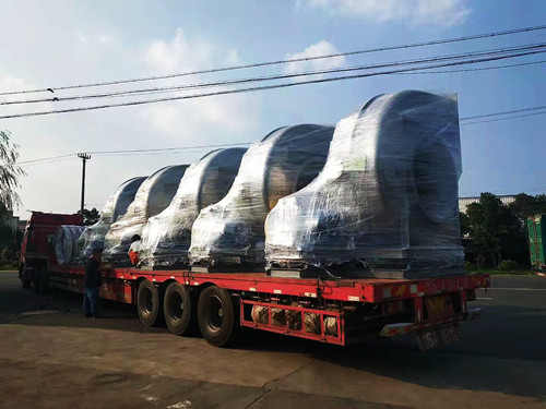 風機的整體尺寸會隨著型號的變大而增加,但是從運輸與安裝的角度考慮,一般最大型號的玻璃鋼離心風機高度極限為3米左右。這種型號的風機對應為14C,長度在2.5-3.5米左右,高度在3米左右。如果需要處理的風量比較大,可使用多臺風機搭配使用。下面是多臺大型號的玻璃鋼離心風機發(fā)貨圖。