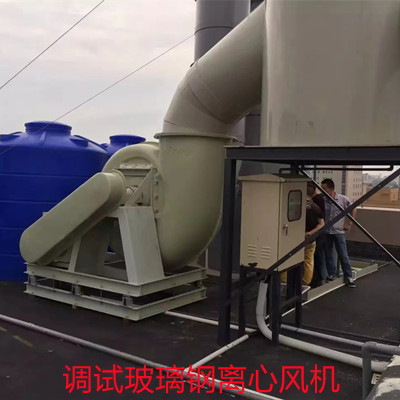 d、將玻璃鋼風機接入廢氣處理系統中,在安裝風機時需要確保地基的平穩性,同時風機的進出口與管道之間最好增加一個軟連接,而且需要對管道進行固定。