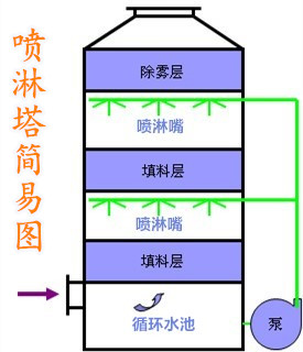 所謂的玻璃鋼噴淋塔,即采用噴淋的方式來(lái)達(dá)到凈化廢氣的效果。如下圖所示,由泵將比例噴淋塔底部的吸收液經(jīng)由噴淋管送至塔體內(nèi)部由噴淋嘴噴出并經(jīng)由填料層與廢氣進(jìn)行充分的接觸。